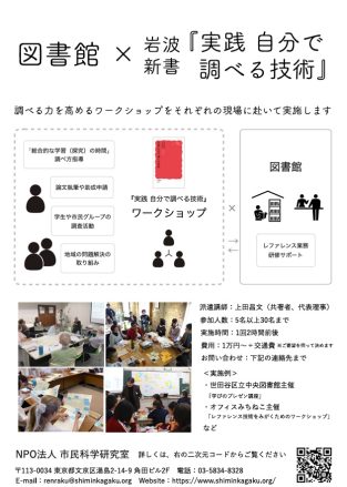 この本の共著者の一人が、各地の住民グループ、サークル、部活動のクラブ、NPO、学校・大学の授業、図書館・公民館の講座などへ赴いて、調べる技術の第1歩を身につけるためのワークショップを実施します。