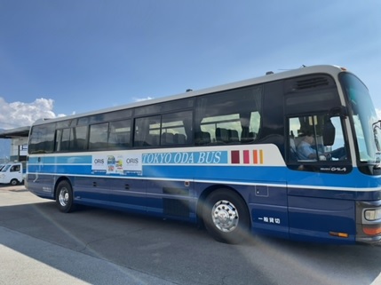 心配していた参加者全員の集合を確認すると出発予定時刻の5分前、幸先の良いスタートとなりました。新宿を出発したバスは壹岐さんの軽妙なトークで一路、ツアーの目的地である山梨県峡東地域(勝沼・塩山・牧丘周辺域)へと向かいます。 乗車するバスは現在では持続可能な航空燃料(SAF)と競合しているために燃料の確保が難しくなっている天ぷらなどの廃油を加工して製造するBDF(バイオディーゼル燃料)を使用する通称【天ぷらバス】です。さらに詳しく説明される壹岐さんのお話は今後公開の動画に譲るものとして、話によれば排ガスの臭いはよく言われるように天ぷらのような揚げ物であるので、試しに嗅ぐのであれば昼食の前の方が良いとのこと。