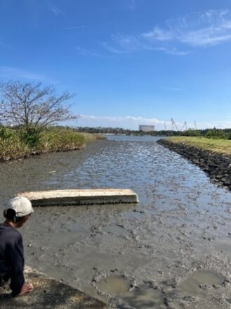 私は、初参加で、たくさんの生きものや鳥を教えていただいたのですが、残念ながらとても覚えきれません。思い出せるのは、泥の中のハゼ、爪が鮮やかな赤色のカニ、干潟の中にすっと立つサギ、黒山のように集まっているカワウ、クッションのようにふかふかのオレンジ色のキノコ、鴨場付近のうっそうとした竹林、などです。青い空を背景に、干潟の上を鳥たちが羽ばたく情景は、気もちを開放的にしてくれました。