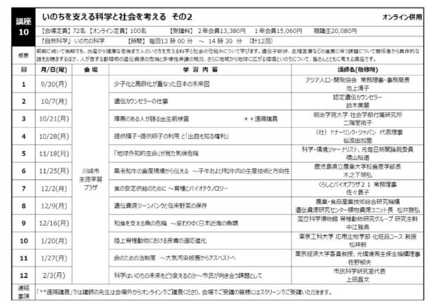 講座10「いのちを支える科学と社会を考える」のなかの第12回「科学はいのちの未来をどう変えるのか~市民が向き合う課題として」です。これはこれまでの11回の講義内容を振り返り、受講生とともに「いのちと社会」をめぐって、市民の立場から何をどう問題として位置づけ、対処していけばよいのか、を探るものです。